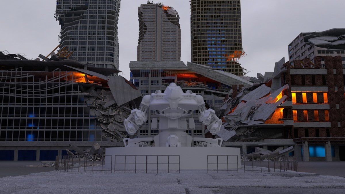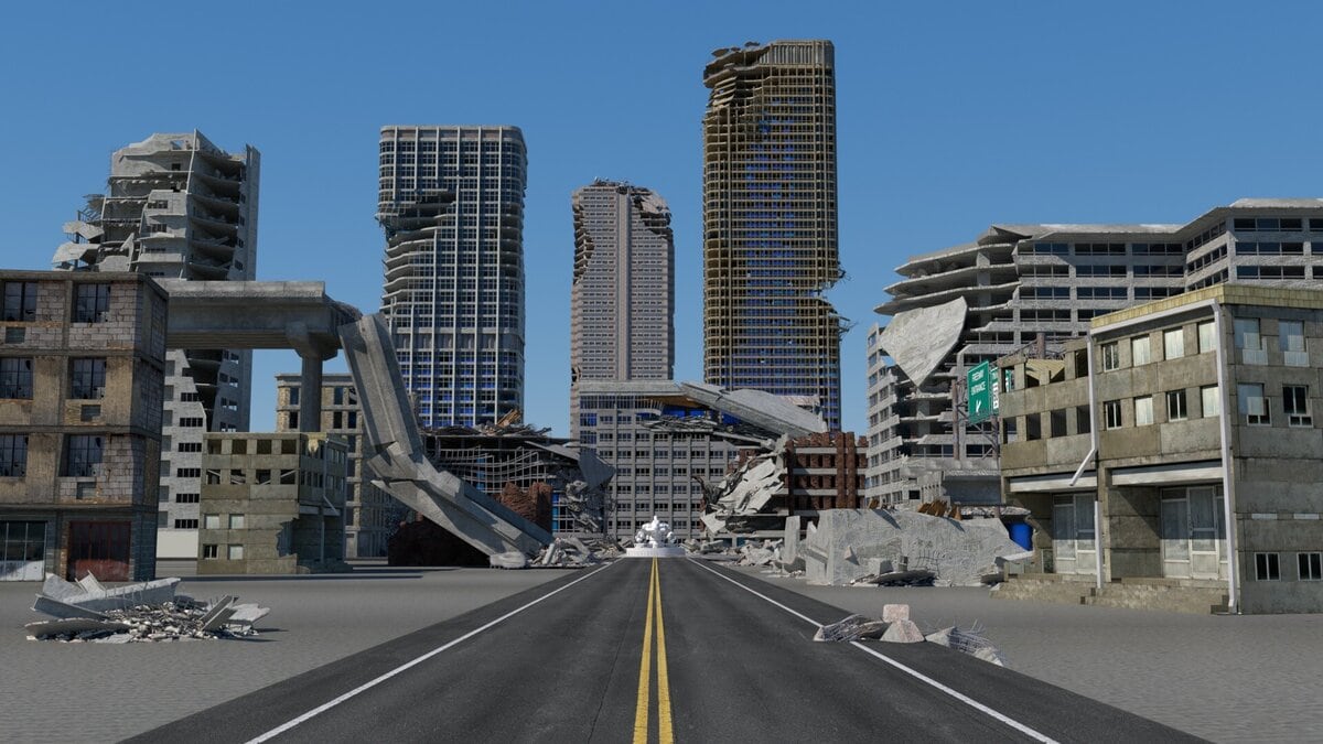 • Création du décor post-apocalyptique (immeubles détruits, gravats, ambiance poussiéreuse)