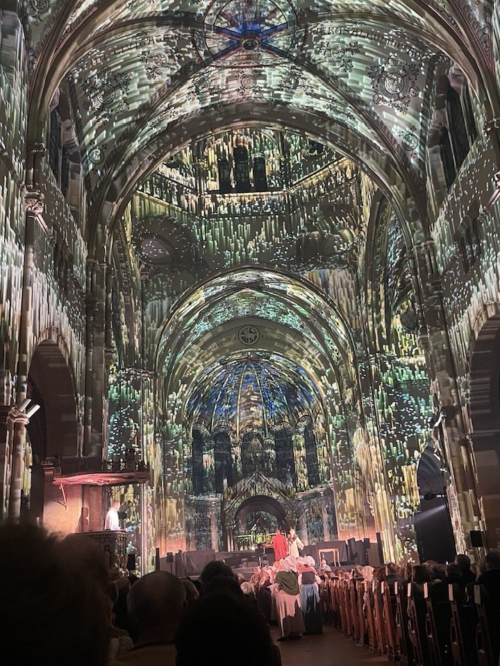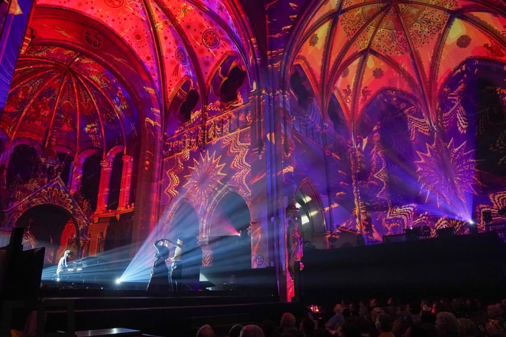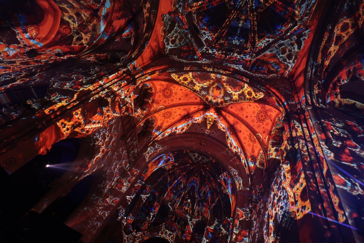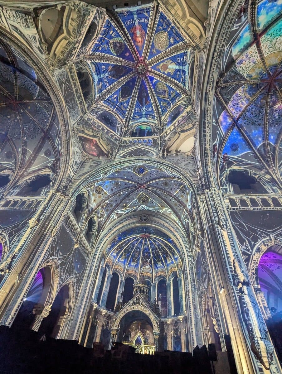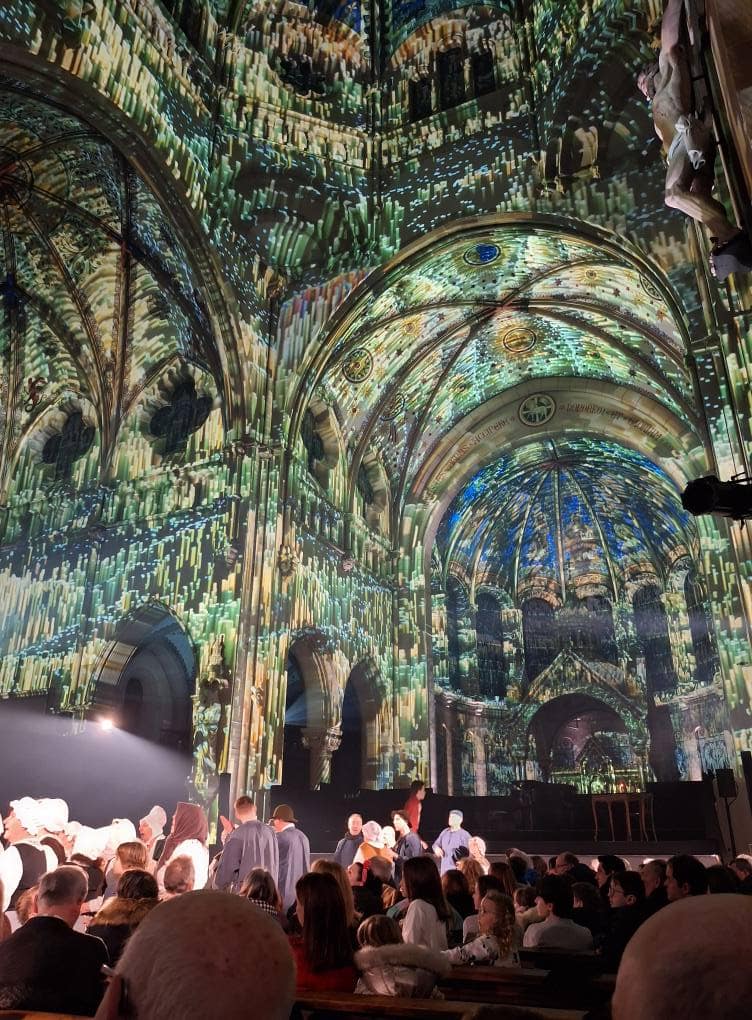 Spectacle immersif habillant la façade de l’église Saint-Sulpice avec des effets monumentaux.