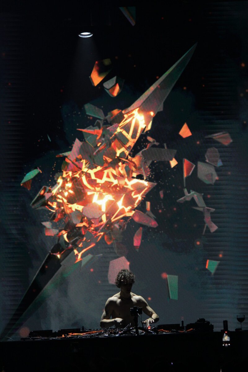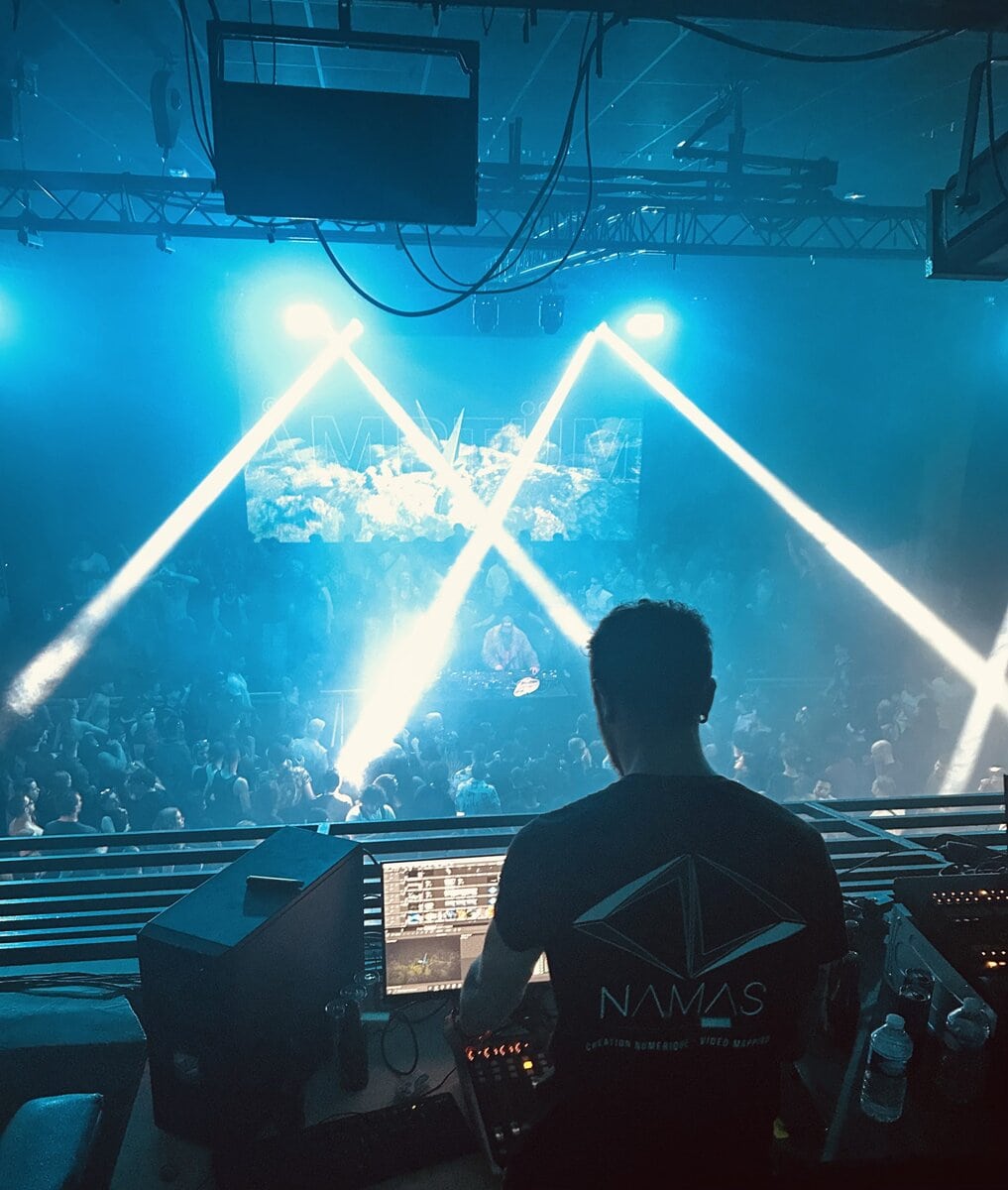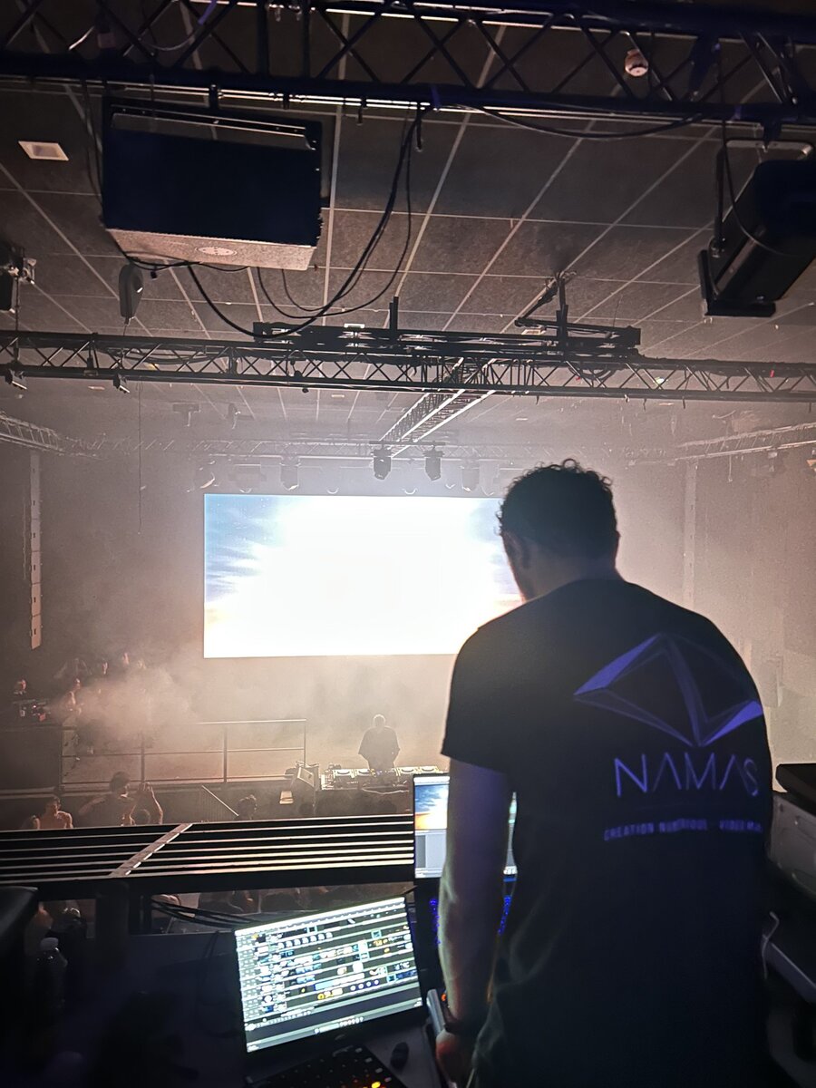 Chaque show est joué en live, avec une régie VJ sur-mesure, me permettant d’adapter le rythme visuel à la musique, à la scénographie et à l’énergie du public.